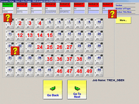 Simply push the section you want to work in. You can custom name the sections as well, ie. Main, Arts, etc. SD3 Newspaper is capable of programming 16 Sections with 50 pages in each section Page icons are pushed if they contain a graybar that you wish to monitor. |