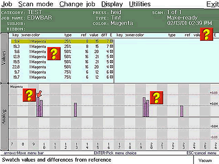 When you place red arrow over a reading and press the "PointToMe" key the SDT will point to that swatch on the actual colorbar of the job.